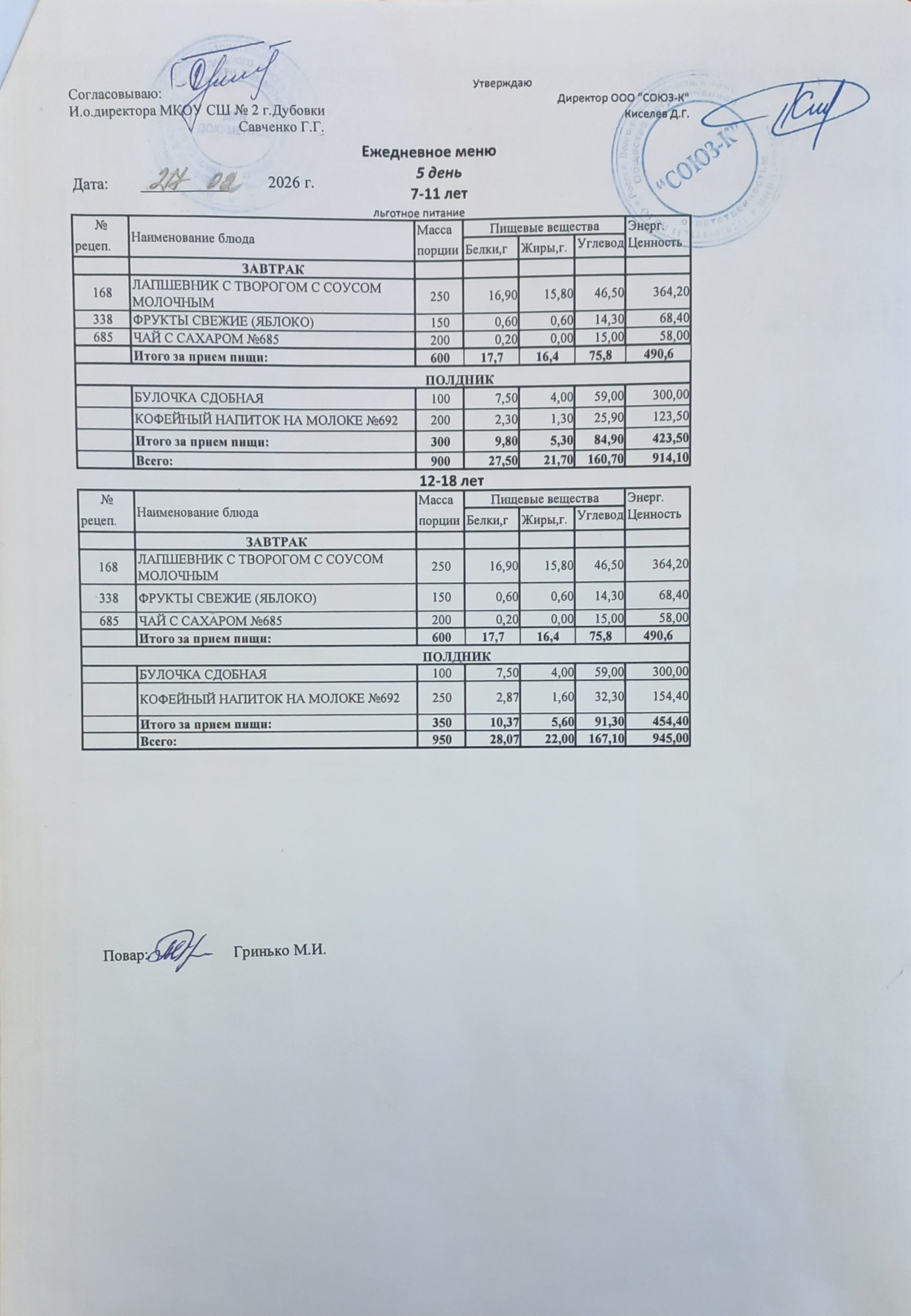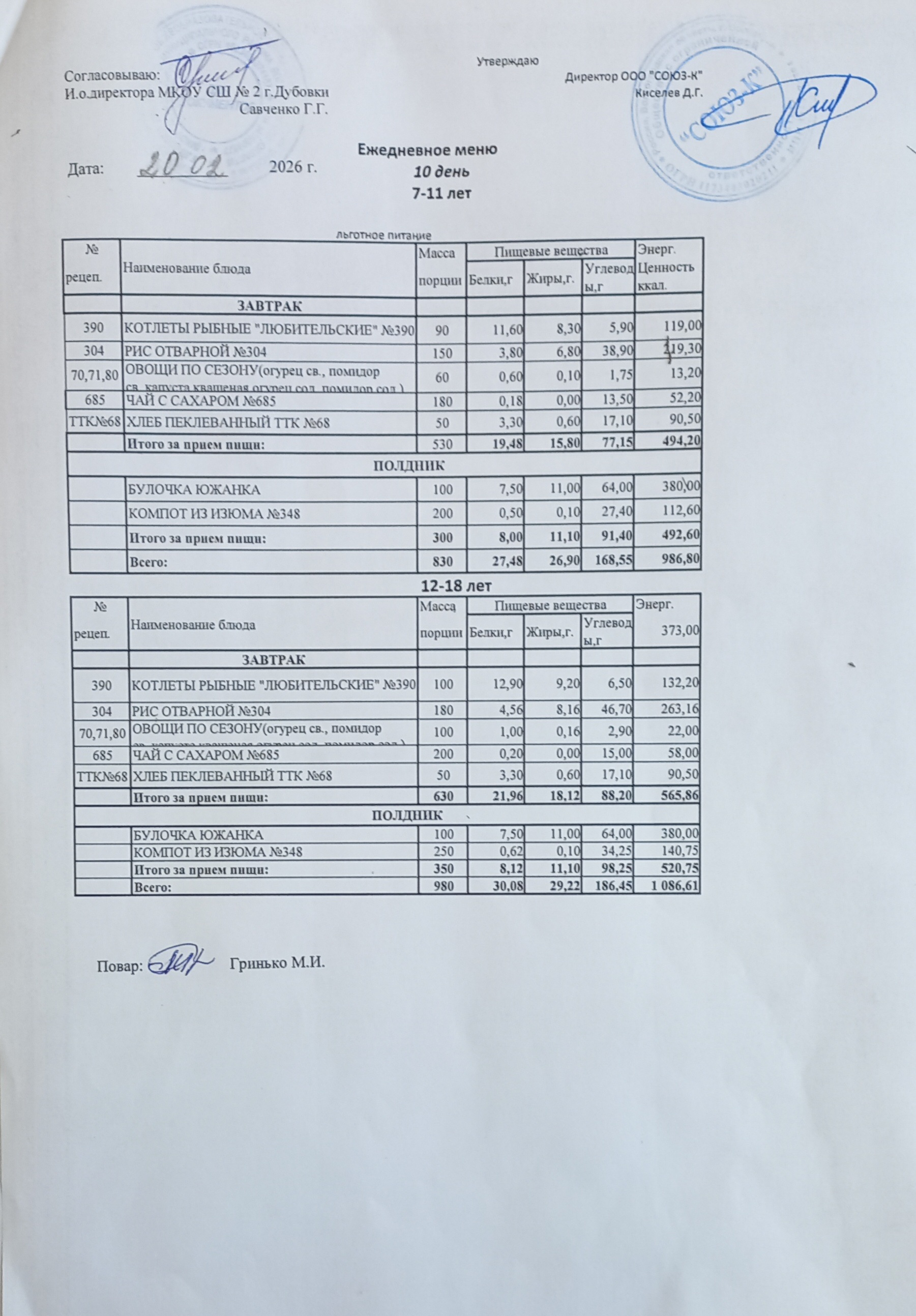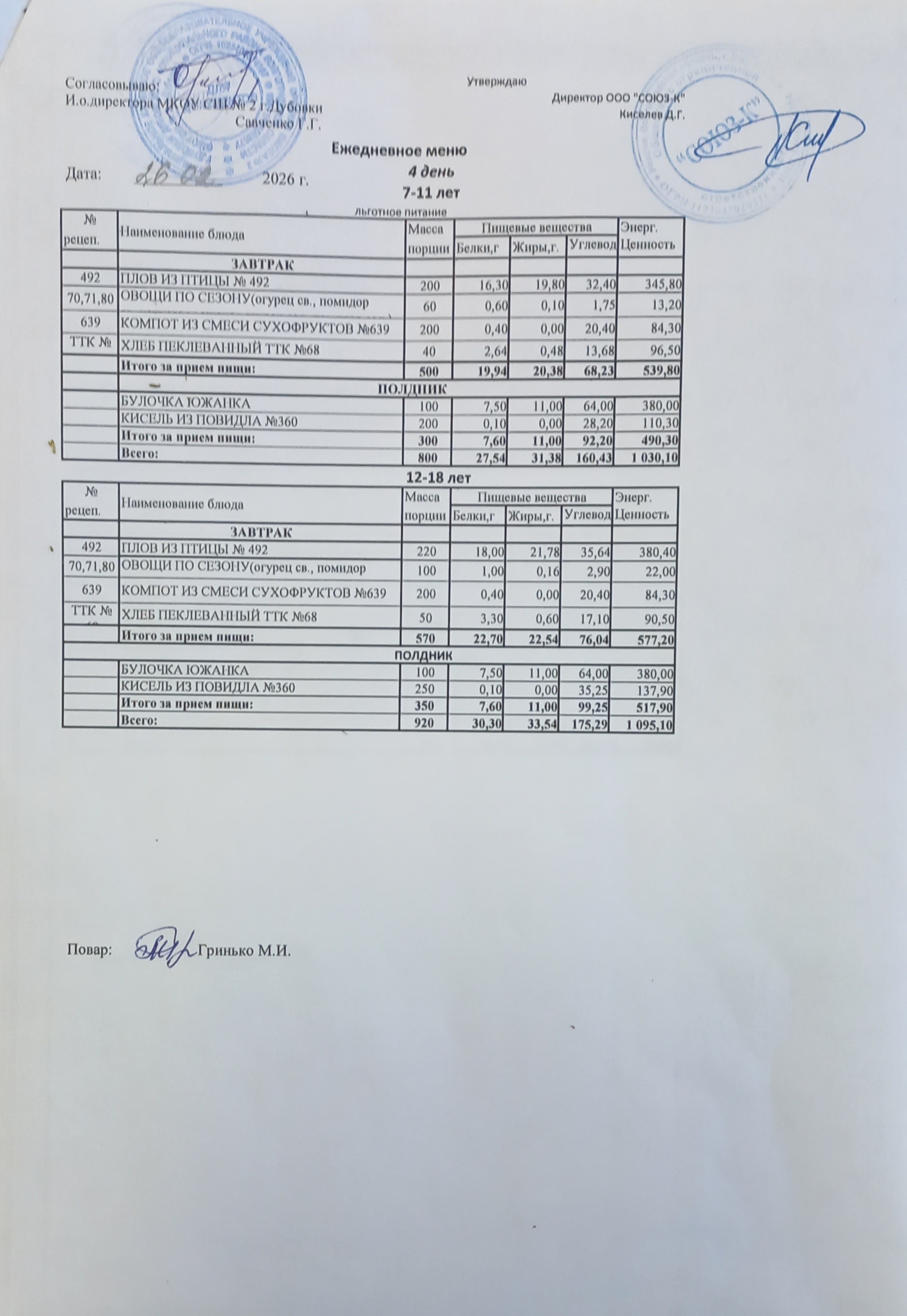 Ответственный за питание в МКОУ СШ №2 г. Дубовки: