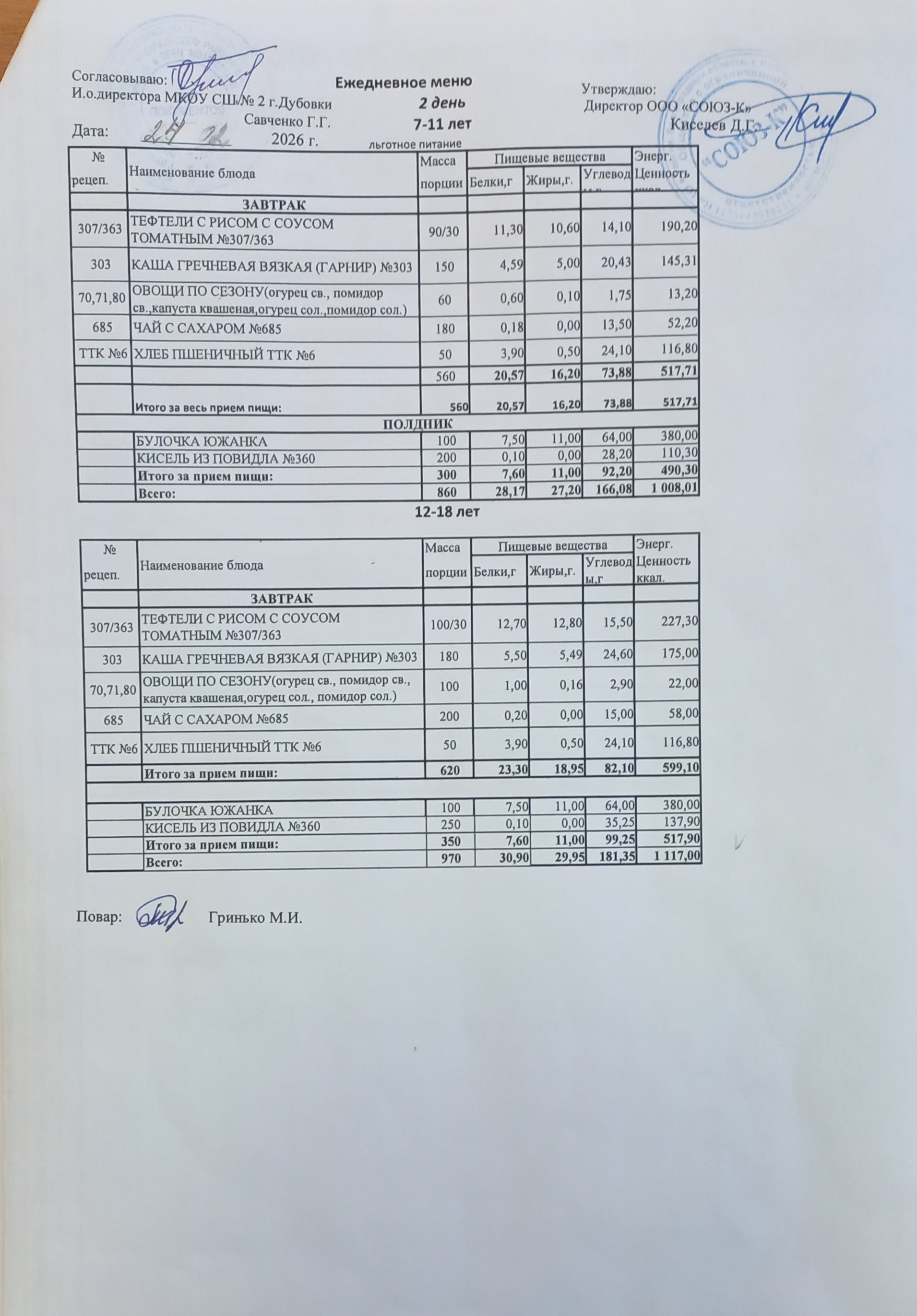 Питание обучающихся МКОУ СШ №2 г. Дубовки
