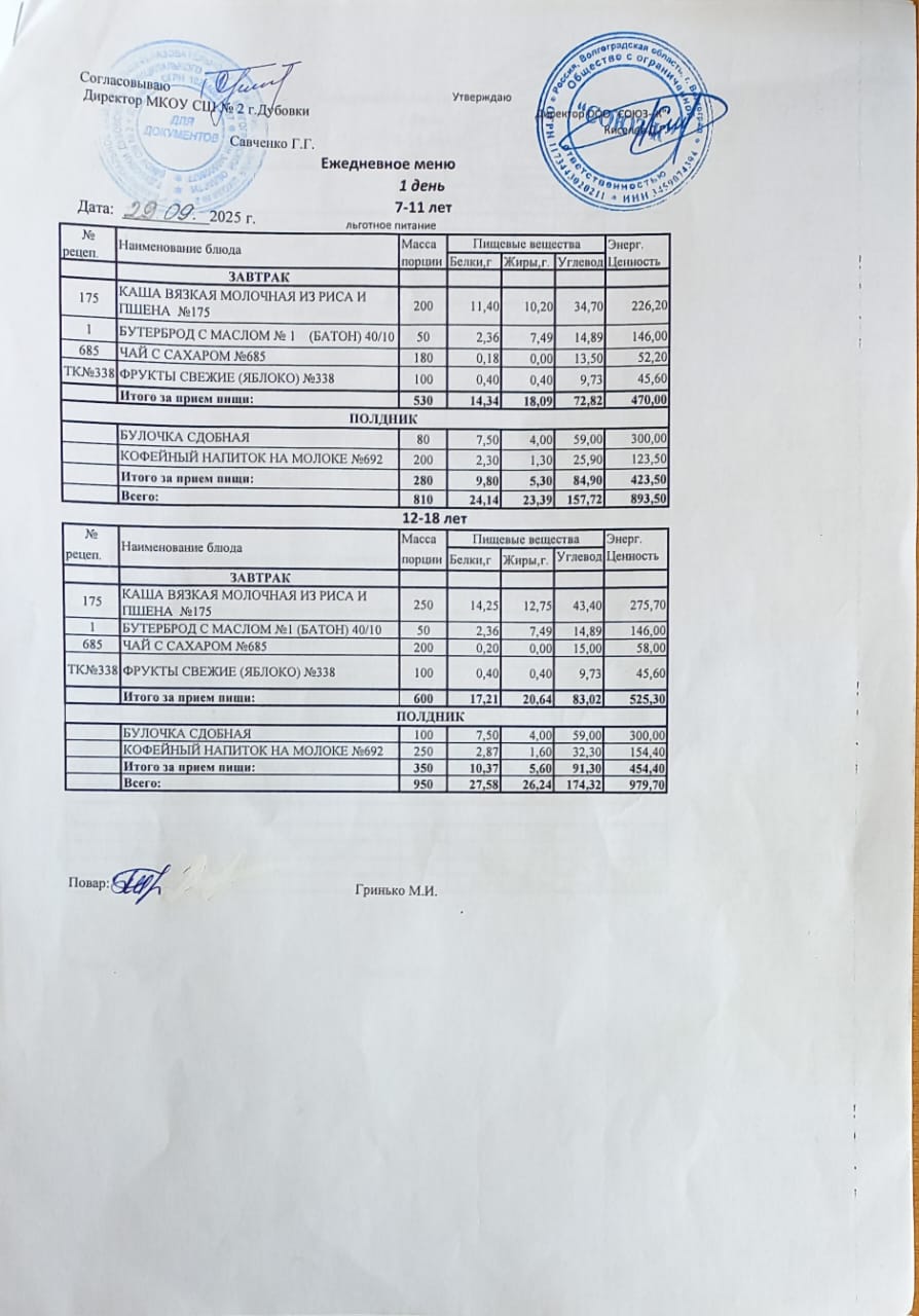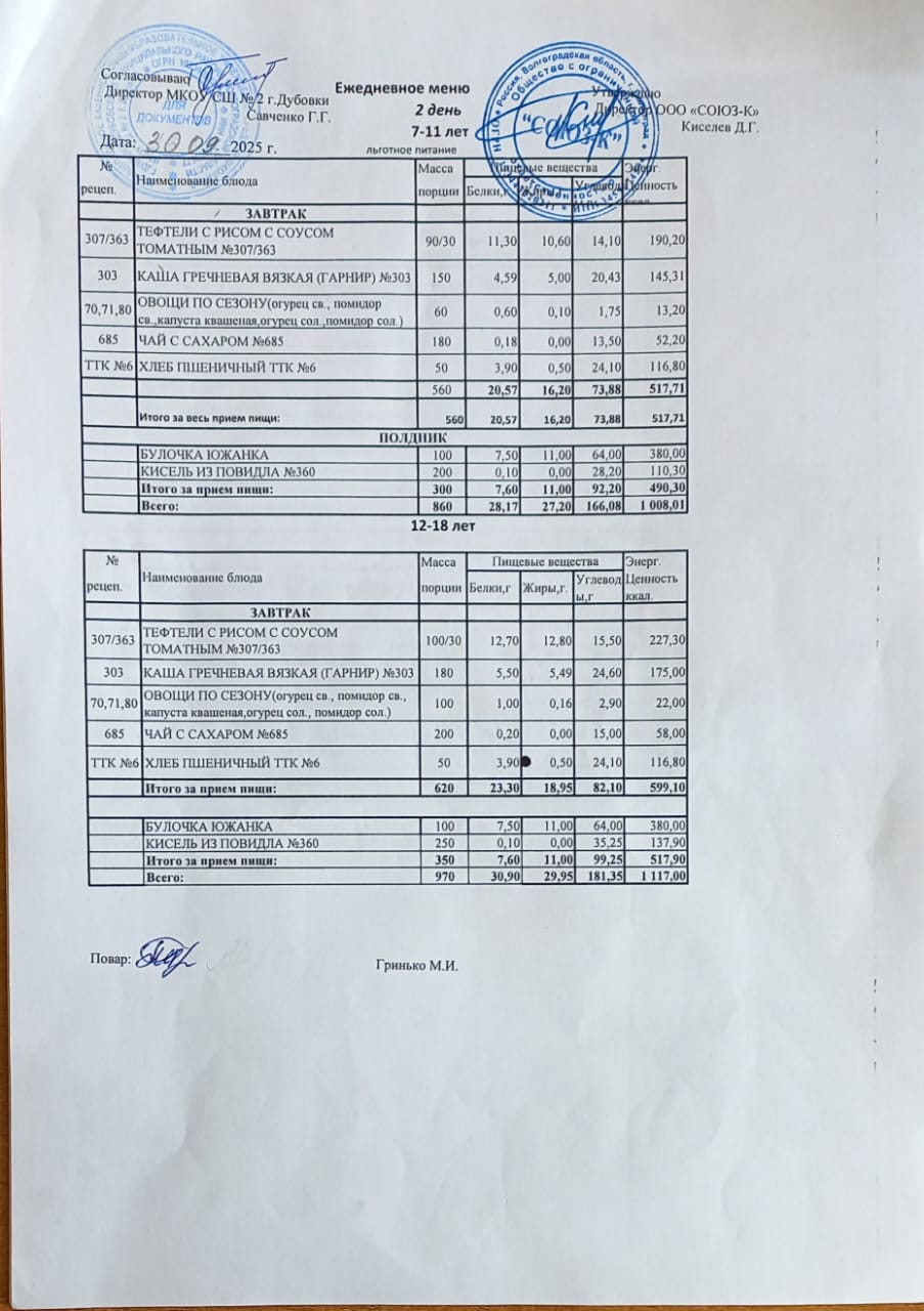 Ежедневное меню СЕНТЯБРЬ 2025 |