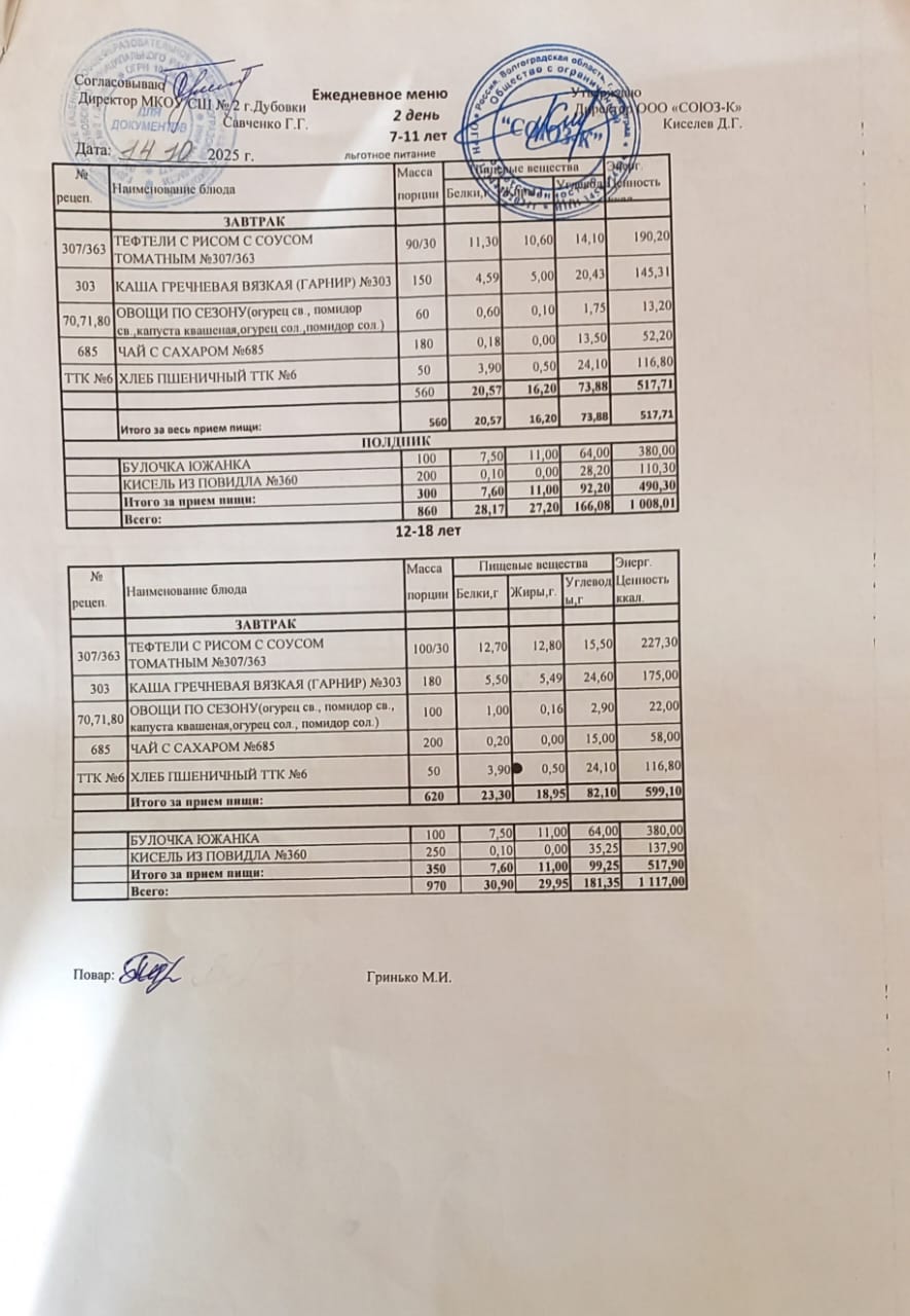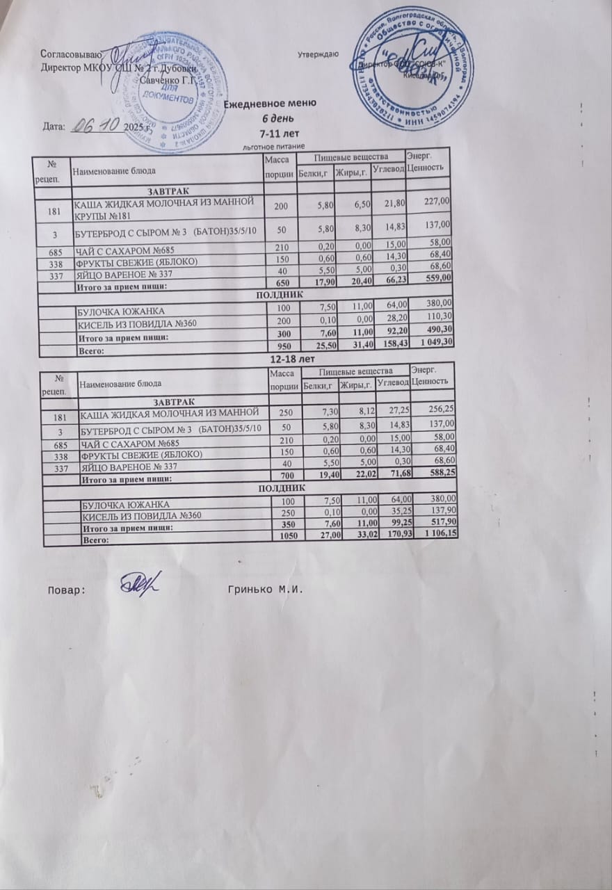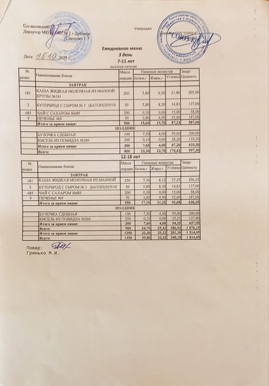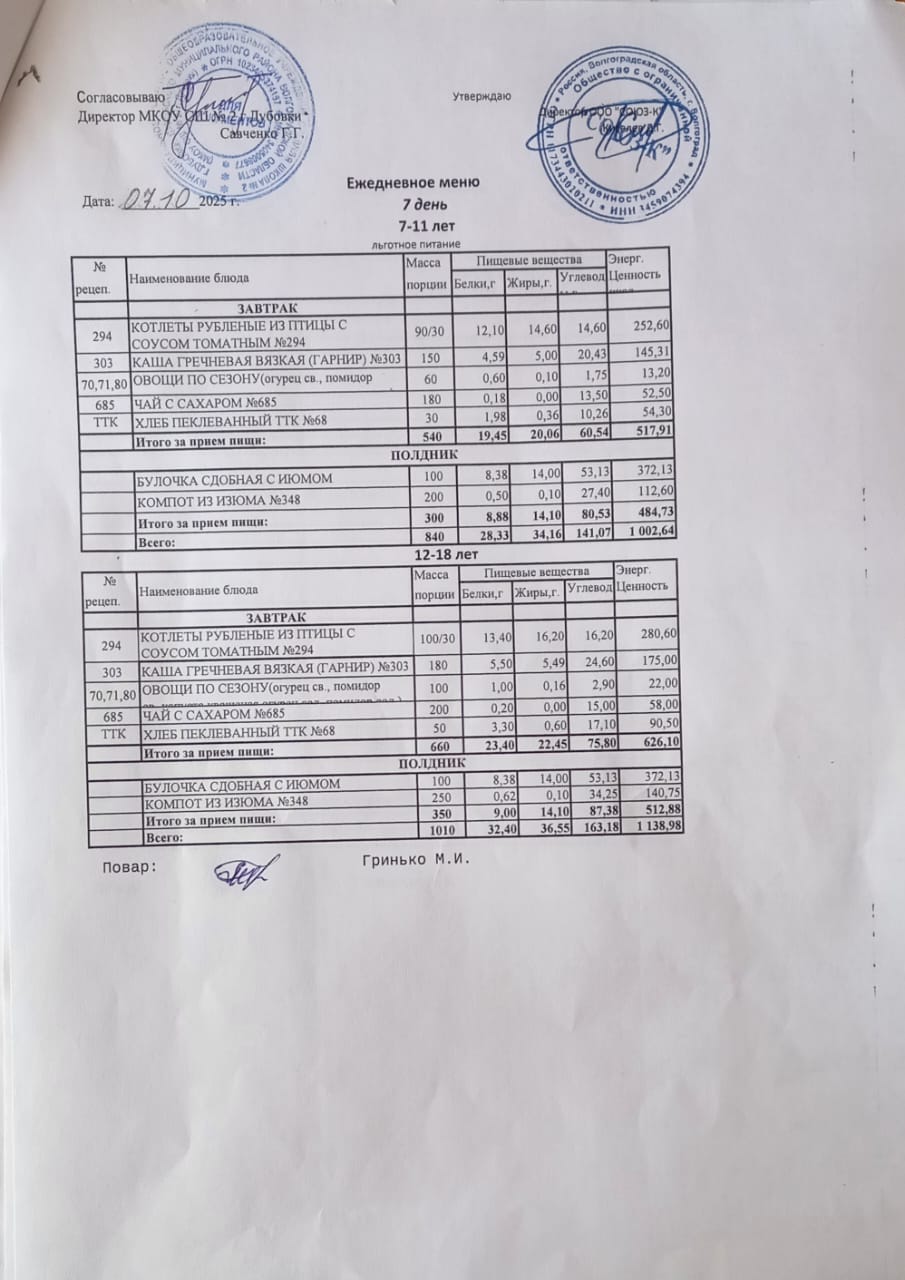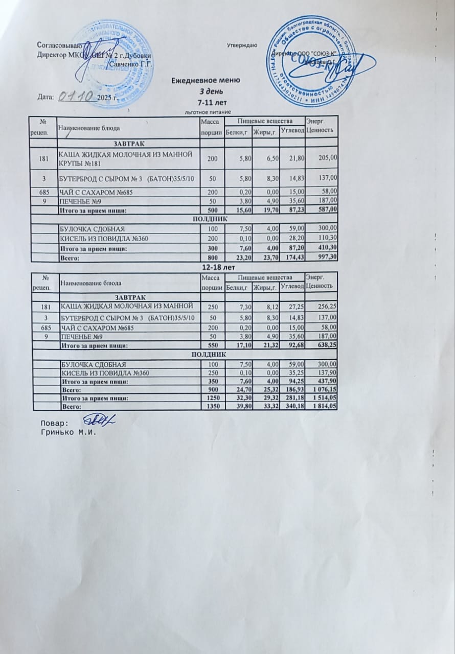 Ежедневное меню ОКТЯБРЬ 2025 |
