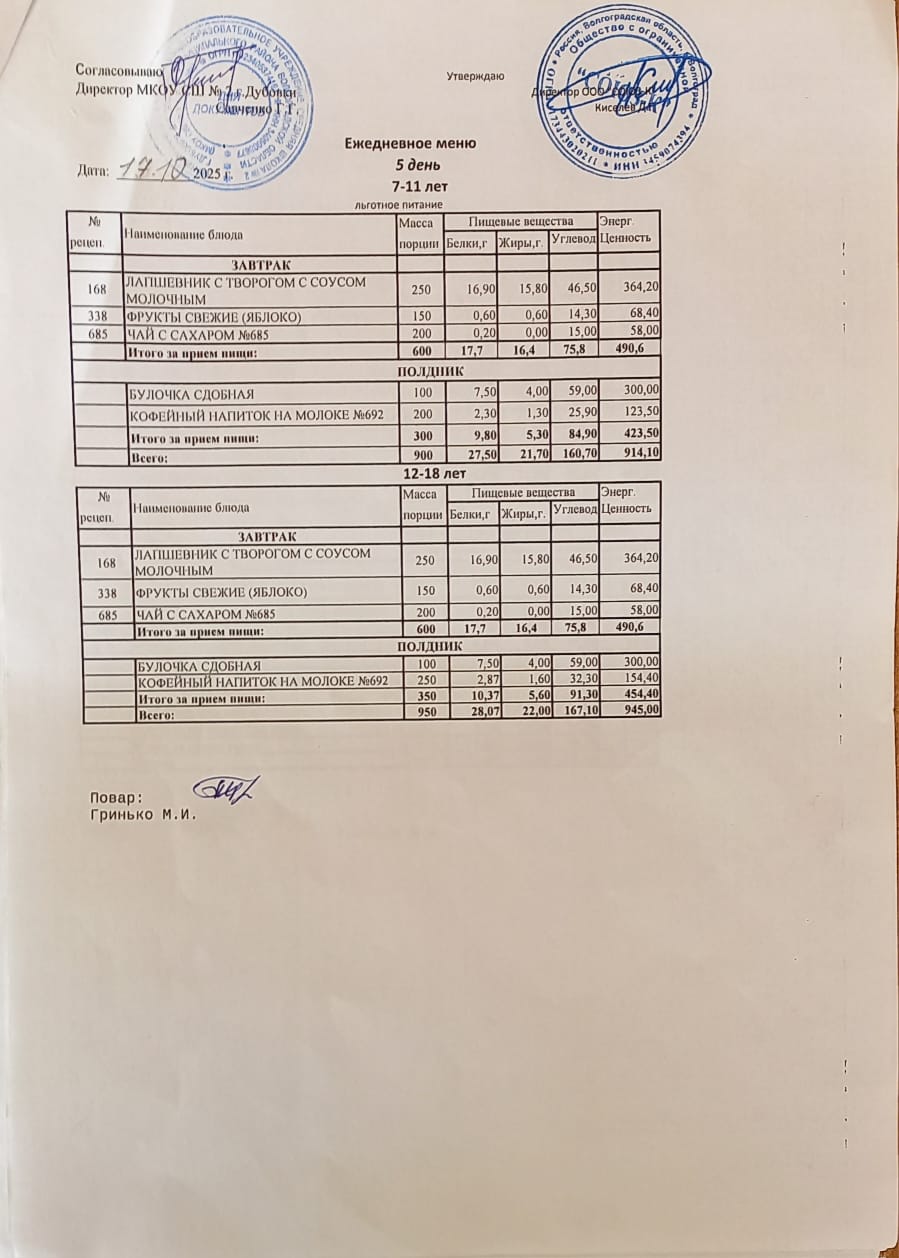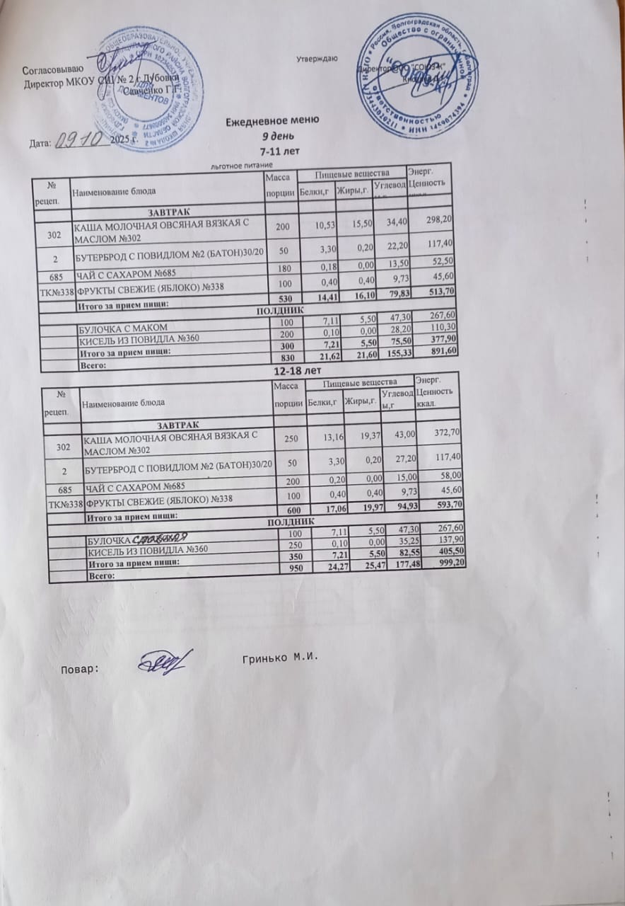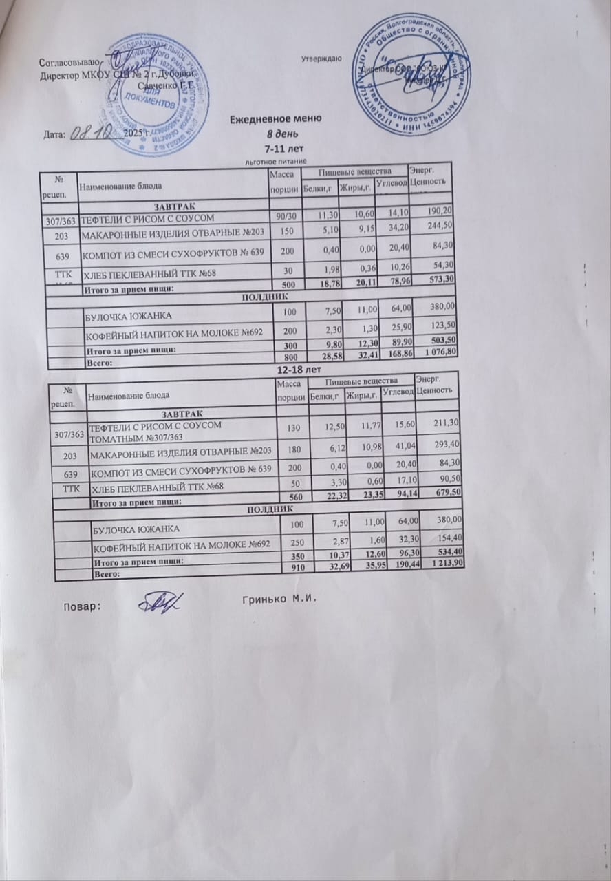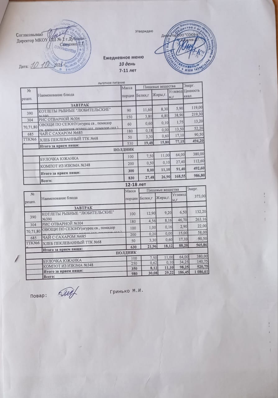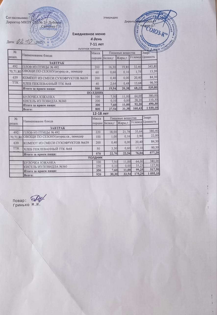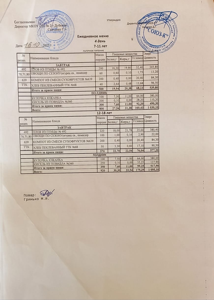 Ежедневное меню ОКТЯБРЬ 2025 |