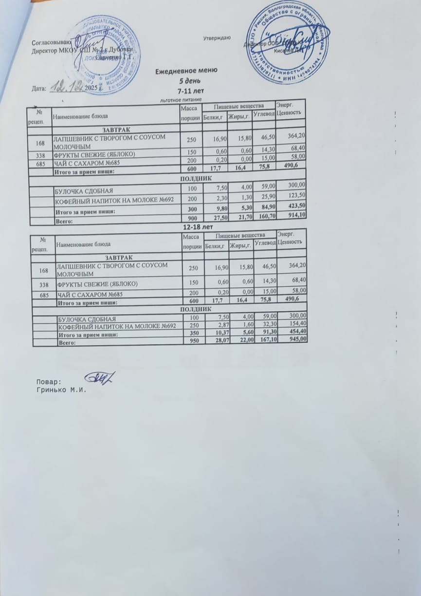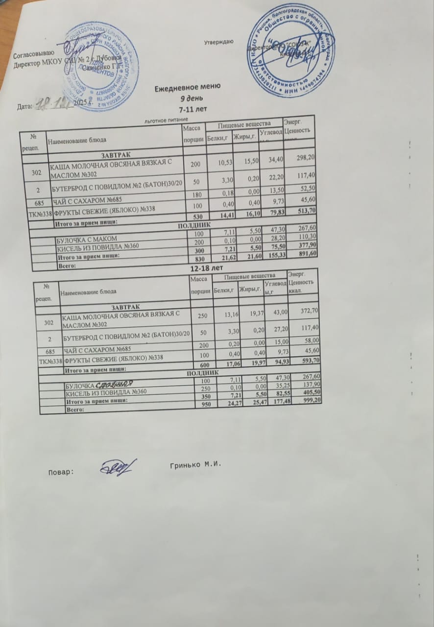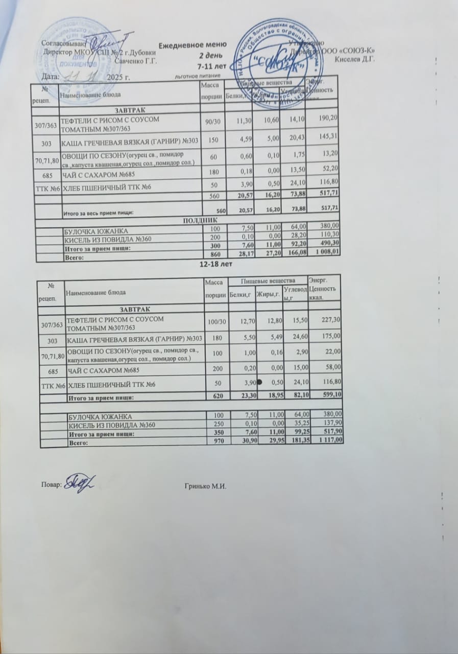 Ответственный за питание в МКОУ СШ №2 г. Дубовки: